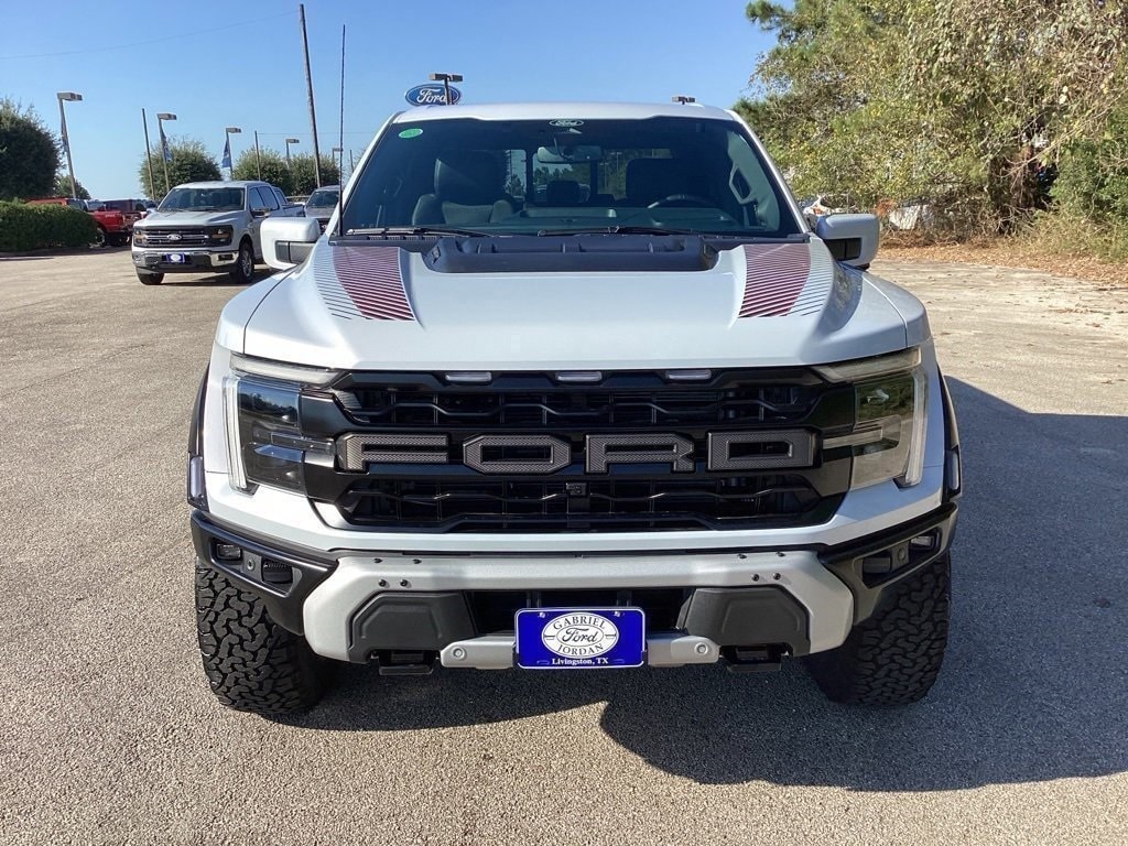 This 2025 Ford F-150 Raptor in Space White Metallic comes with the following features: 3.5L V6 EcoBoost 10-Speed Automatic 4WD 4WD Equipment Group 802A Raptor 37 (Carbon Fiber Interior Appliques, Dual Valve Shocks, Modular Front Bumper, RECARO Alcantara Suede Front Seats, and Wheels: Raptor 37 Unique 17" Cast Aluminum), 4WD, 14 Speakers, 17" Cast Aluminum Wheels, 4-Wheel Disc Brakes, ABS brakes, Adjustable pedals, Air Conditioning, Alloy wheels, AM/FM radio: SiriusXM with 360L, Auto High-beam Headlights, Auto tilt-away steering wheel, Auto-dimming door mirrors, Auto-dimming Rear-View mirror, Automatic temperature control, Brake assist, Bumpers: body-color, Compass, Delay-off headlights, Driver door bin, Driver vanity mirror, Dual front impact airbags, Dual front side impact airbags, Electronic Locking w/4.10 Axle Ratio, Electronic Stability Control, Emergency communication system: SYNC 4 911 Assist, Front anti-roll bar, Front Bucket Seats, Front Center Armrest, Front dual zone A/C, Front fog lights, Front License Plate Bracket, Front reading lights, Front wheel independent suspension, Fully automatic headlights, Garage door transmitter, Heads-Up Display, Heated door mirrors, Heated front seats, Heated rear seats, Heated steering wheel, Illuminated entry, Lane Departure Warning System, Leather steering wheel, Leather Trimmed Seats, Low tire pressure warning, Memory seat, Navigation system: Connected Navigation, Occupant sensing airbag, Outside temperature display, Overhead airbag, Overhead console, Panic alarm, Passenger door bin, Passenger vanity mirror, Pedal memory, Power door mirrors, Power driver seat, Power passenger seat, Power steering, Power windows, Radio data system, Radio: B&O Unleashed Sound System by Bang & Olufsen, Rain sensing wipers, Rear reading lights, Rear step bumper, Rear window defroster, Remote keyless entry, Security system, Speed control, Speed-sensing steering, Split folding rear seat, Steering wheel memory, Steering wheel mounted audio controls, SYNC 4 w/Enhanced Voice Recognition, Tachometer, Telescoping steering wheel, Tilt steering wheel, Traction control, Trip computer, Turn signal indicator mirrors, Twin Panel Moonroof, Variably intermittent wipers, and Ventilated front seats.