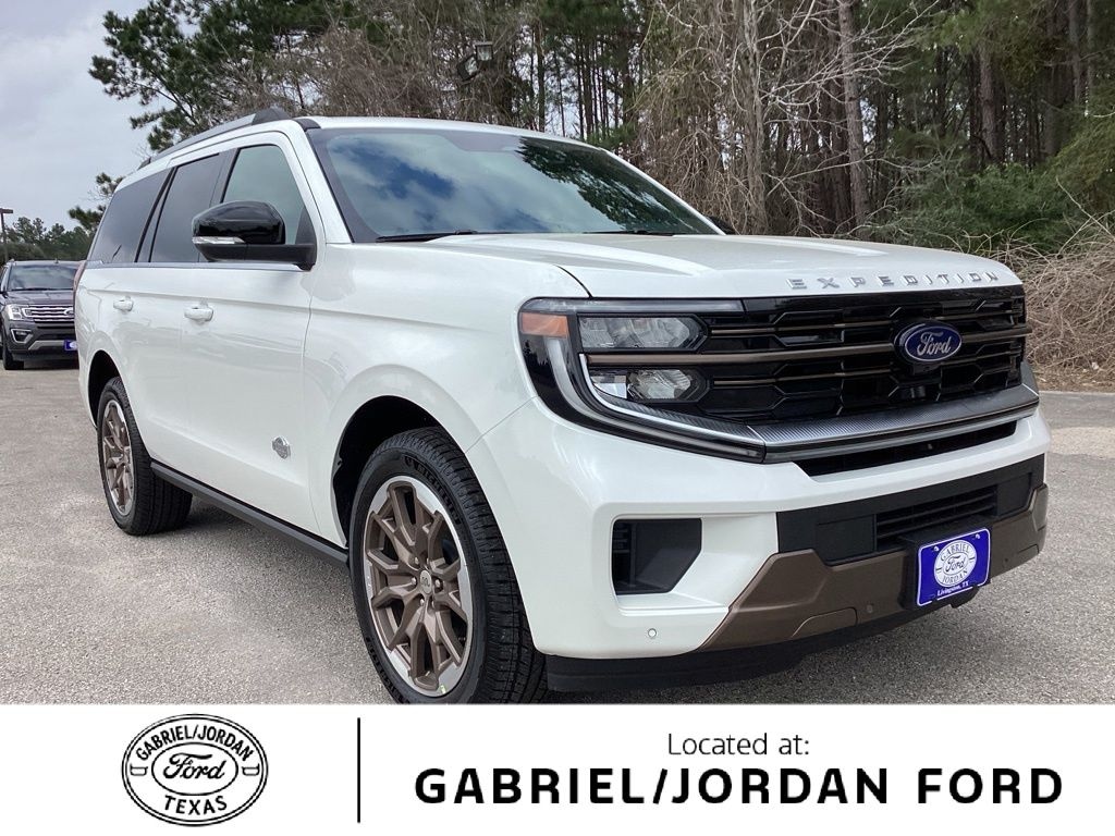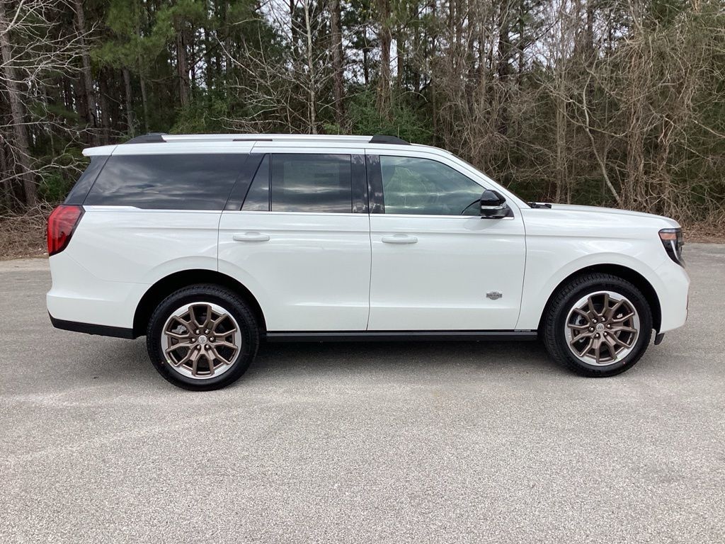 This 2026 Ford Expedition King Ranch in Star White Metallic Tri-Coat comes with the following features: EcoBoost 3.5L V6 GTDi DOHC 24V Twin Turbocharged 10-Speed Automatic 4WD 4WD Equipment Group 400A (3.73 Axle Ratio, Digital Device Holder, Heated/Ventilated Premium Del Rio Leather Front Captain's Chairs, and Wheels: 22" x 9.0" Diamond Cut Machined Face Aluminum), Ford Connectivity Package (1-Year Included), 4WD, 22 Speakers, 3rd row seats: split-bench, 4-Wheel Disc Brakes, ABS brakes, Adaptive suspension, Adjustable pedals, Air Conditioning, Alloy wheels, AM/FM radio: SiriusXM with 360L, Apple CarPlay/Android Auto, Auto High-beam Headlights, Auto-dimming door mirrors, Auto-dimming Rear-View mirror, Automatic temperature control, Brake assist, Bumpers: body-color, Compass, Delay-off headlights, Driver door bin, Driver vanity mirror, Dual front impact airbags, Dual front side impact airbags, Electronic Stability Control, Emergency communication system: 911 Assist, Exterior Parking Camera Rear, Ford Digital Experience, Four wheel independent suspension, Front anti-roll bar, Front Bucket Seats, Front Center Armrest, Front dual zone A/C, Front License Plate Bracket, Front reading lights, Fully automatic headlights, Garage door transmitter, Genuine wood dashboard insert, Genuine wood door panel insert, Heated door mirrors, Heated front seats, Heated rear seats, Heated steering wheel, Illuminated entry, Leather steering wheel, Low tire pressure warning, Memory seat, Navigation System, Occupant sensing airbag, Outside temperature display, Overhead airbag, Overhead console, Panic alarm, Passenger door bin, Passenger vanity mirror, Pedal memory, Power door mirrors, Power driver seat, Power moonroof: Vista Roof, Power passenger seat, Power steering, Power windows, Radio data system, Radio: B&O Unleashed Sound System by Bang & Olufsen, Rain sensing wipers, Rear air conditioning, Rear anti-roll bar, Rear reading lights, Rear window defroster, Rear window wiper, Reclining 3rd row seat, Remote keyless entry, Security system, SiriusXM with 360L, Speed control, Speed-sensing steering, Speed-Sensitive Wipers, Split folding rear seat, Spoiler, Steering wheel memory, Steering wheel mounted audio controls, Tachometer, Telescoping steering wheel, Tilt steering wheel, Traction control, Trip computer, Turn signal indicator mirrors, Variably intermittent wipers, Ventilated front seats, and Voltmeter.
